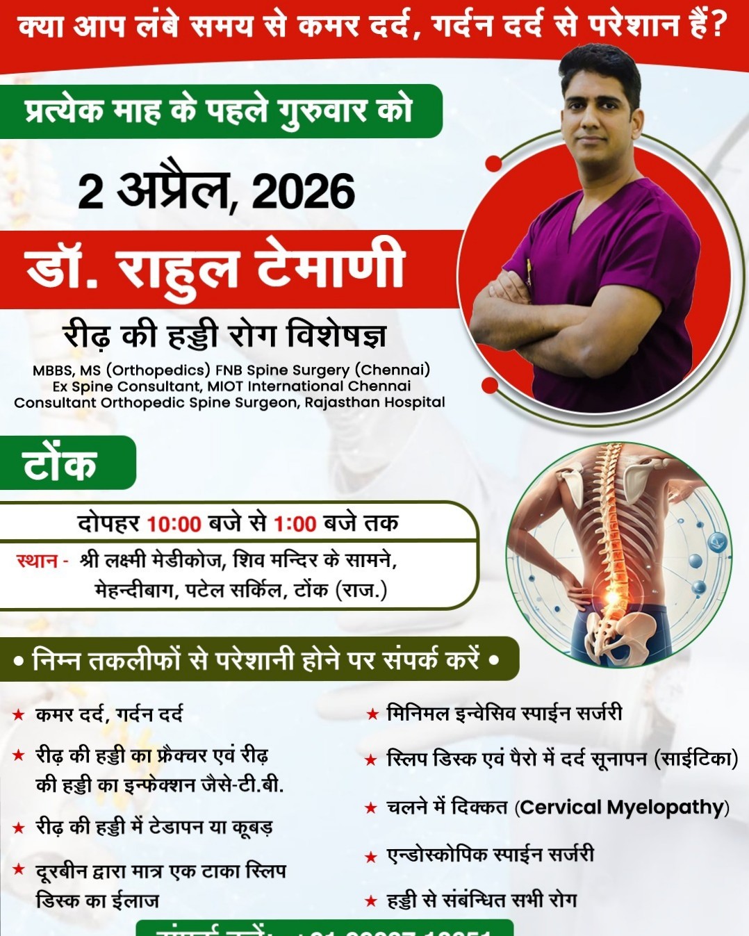 🌟 चेन्नई से प्रशिक्षित एवं राजस्थान हॉस्पिटल, जयपुर के डॉ राहुल टेमाणी (रीढ़ की हड्डी रोग विशेषज्ञ) - टोंक में अपनी सेवाएं देंगे |